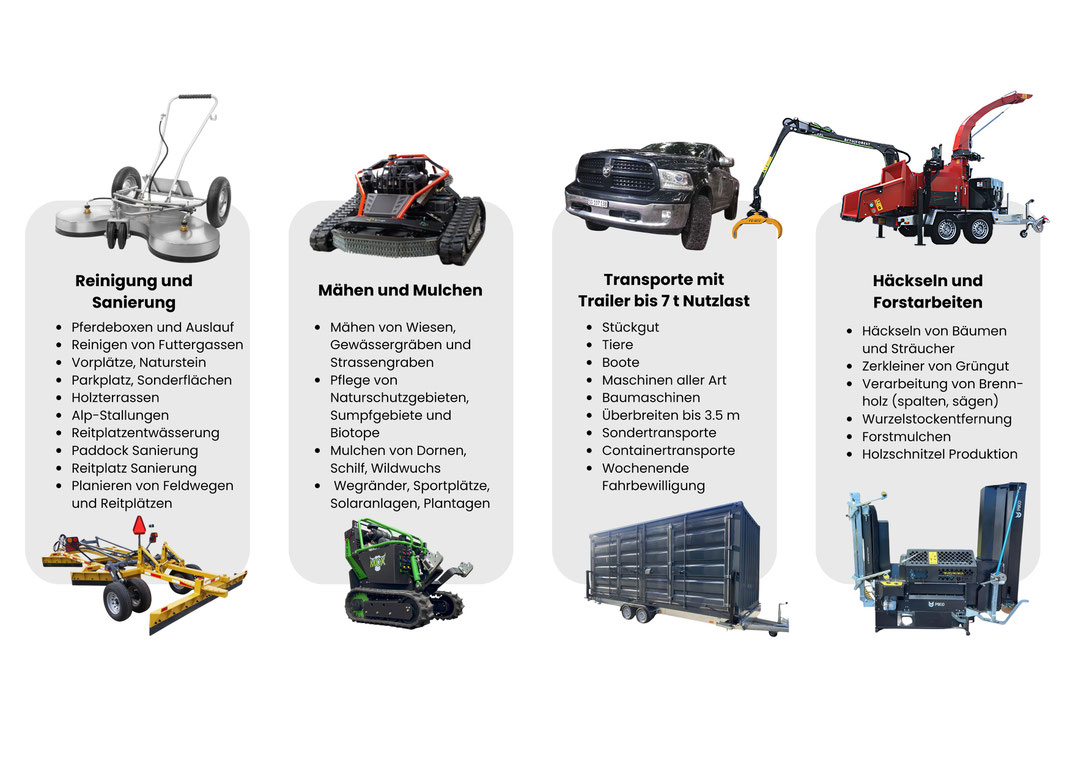 Wir bieten nicht nur Dienstleistungen rund um die Flächenreinigung, insbesondere in Futtergassen und Pferdeboxen an, sondern sanieren auch Pferdepaddock, Schnitzelplätze, Forst- und Waldwege. Mit unseren Mäh- und Mulcharbeiten rund um die Grünflächen, halten wir Gewässergräben entlang von Strassen und Dämme im Schuss und halten Verbuschungen in Weiden, Solarparkanlagen und an Waldrändern im Zaum.