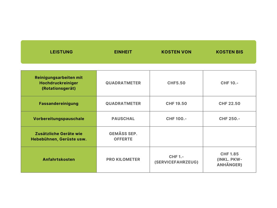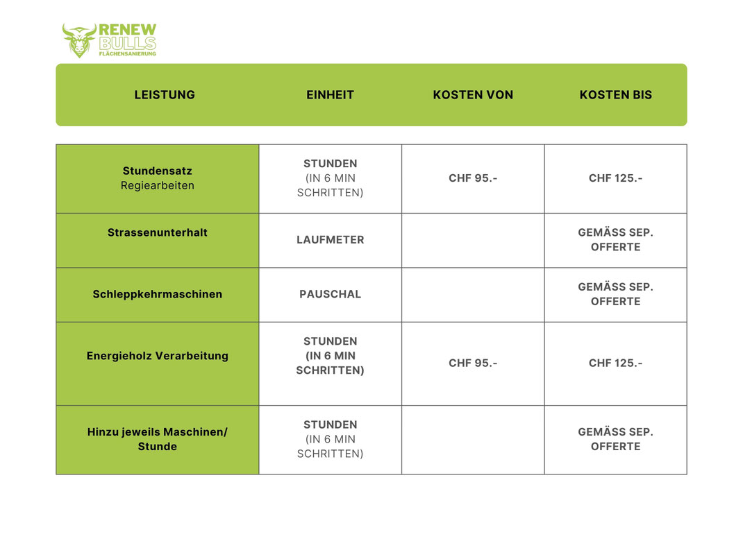 Diese Preisliste dient ausschliesslich als ungefähre Preisdimension für Sie. Finale Angebotspreise sind Abhängig von individuellen Projektgegebenheiten wie z. B. der Flächengrösse oder Kundenwünschen.
